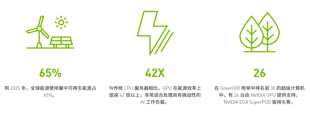 為(wèi)這(zhè)些(xiē)項目提供支持的(deε↑✘) NVIDIA GPU 性能(néng)表現(£↓☆xiàn)優異 – 在 GPU 上(shàng)進行(xíng)并行(xí♠αng)處理(lǐ)的(de)能(néng)耗比傳統 CP♣∏γU 減少(shǎo)了(le) 42 倍。不(bΩ∑★ù)僅如(rú)此,NVIDIA DGX SuperPOD 系統還(há •↓i)在最新的(de) Green500 超級計(jì)算(suàn)機(jī)" ™效率榜單中位列榜首,創下(xià)新的(de)能(néng)效世界紀錄≤✘&。榜單中排名前 30 的(de)超級計(jì)算(suàn≥∞®©)機(jī)有(yǒu) 26 台采用(y©òng) NVIDIA 技(jì)術(shù)。我們還(÷→hái)宣布推出 400-petaflops Cambridg♠♦e-1 超級計(jì)算(suàn)機(jī),這(zhè)是(shì)我₩&×α們第一(yī)台 100% 使用(yòng)可(kě)再生(shēφ'πng)能(néng)源的(de)超級計(jì)算(suàn)機(jī)。